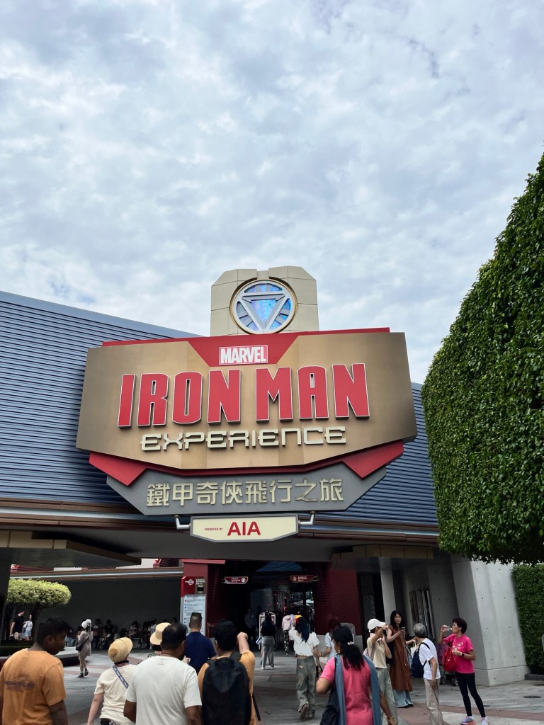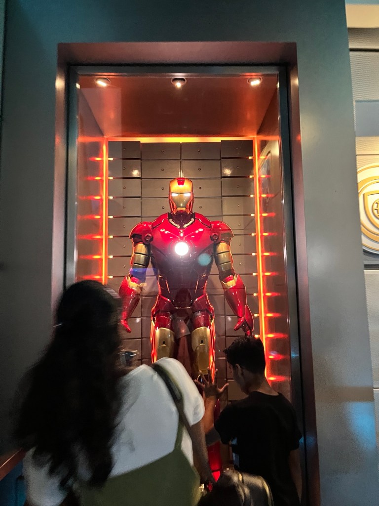 これはアイアンマン好きには堪らないアトラクションで、キューラインにはアイアンマンの映画にも登場した初期のアイアンマン(鉄の大きいやつ)が飾られていたり、いろいろなものが展示されています!